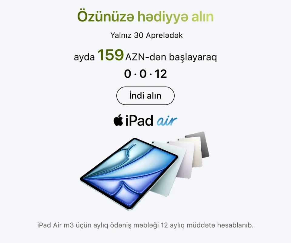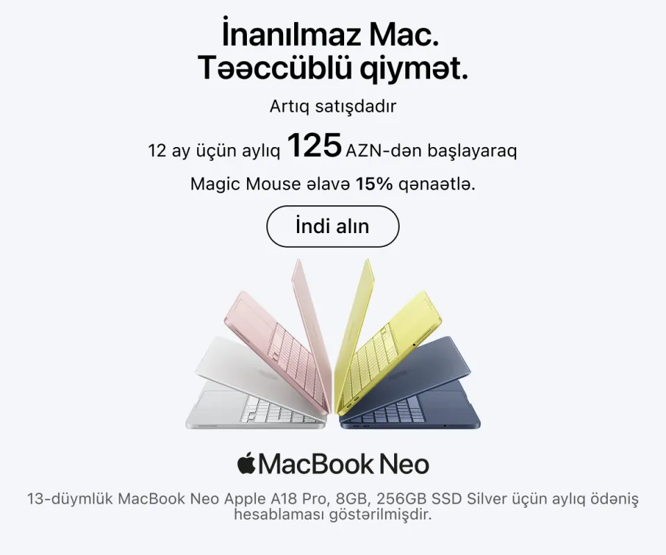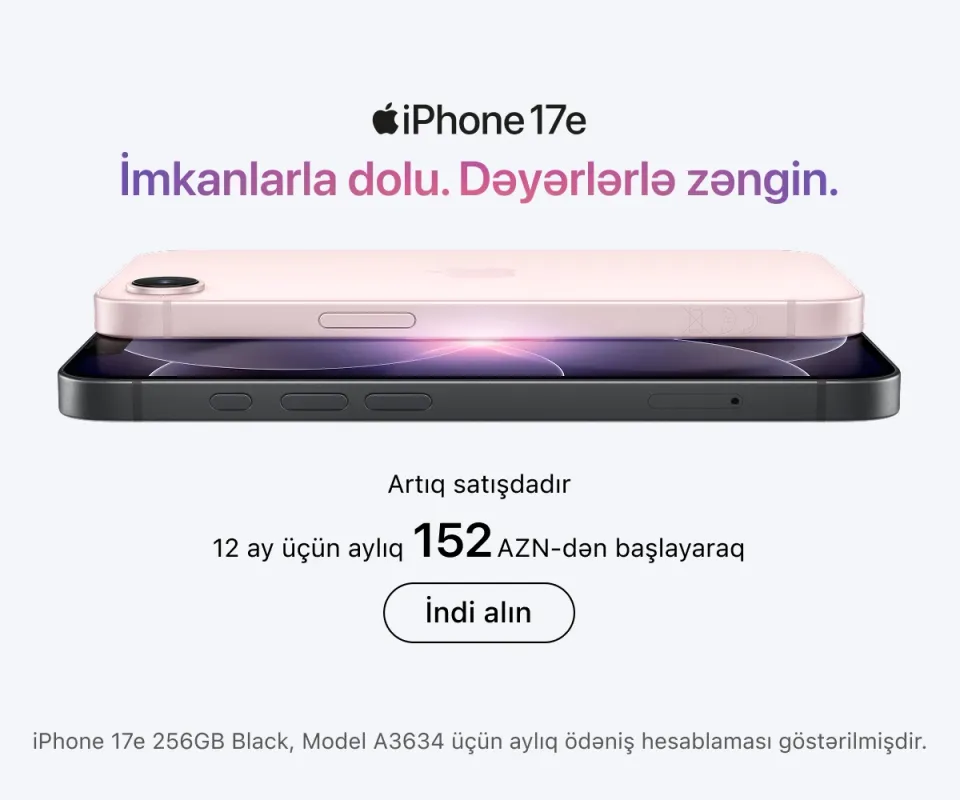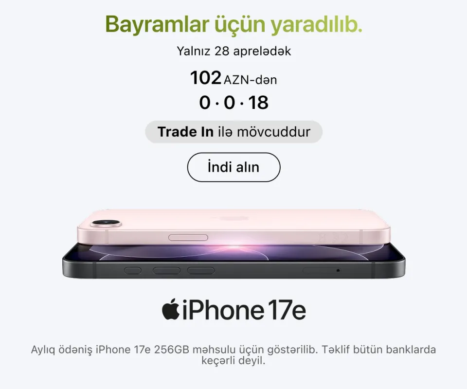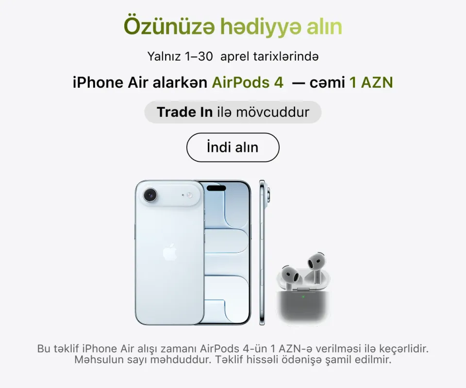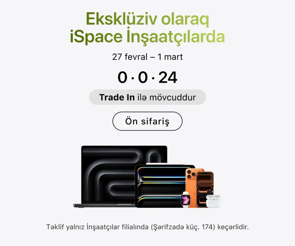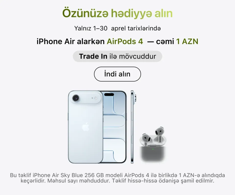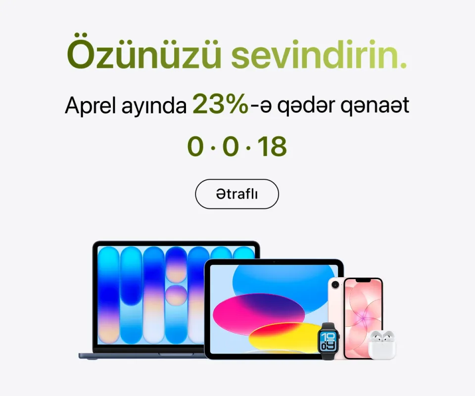 Ən son model iPhone-lar – həm baza versiyaları, həm də Pro variantları daim mövcuddur. İş, təhsil və yaradıcılıq üçün iPad və MacBook modellərini, stasionar istifadə üçün isə iMac, Mac Studio və Studio Display ekranını seçə bilərsiniz.