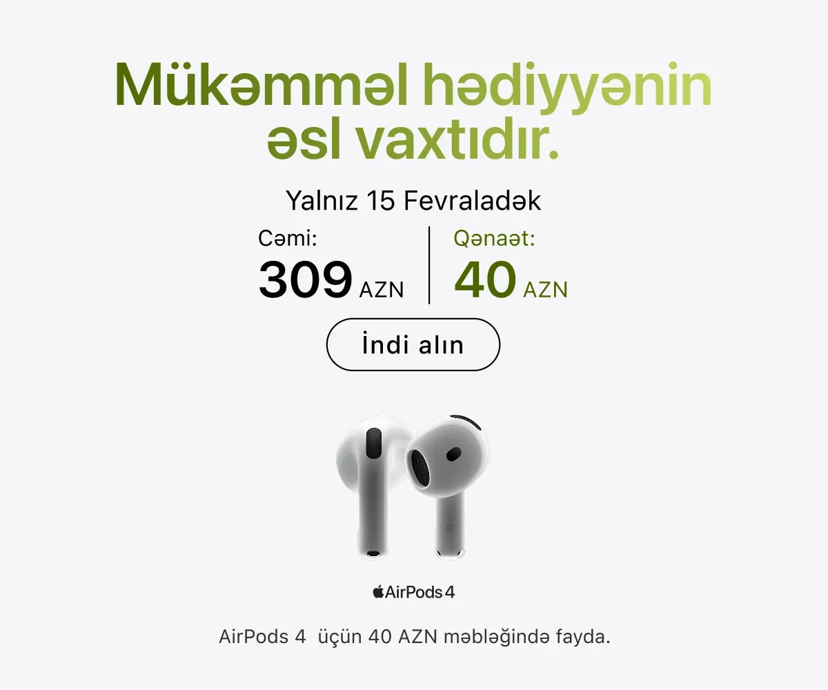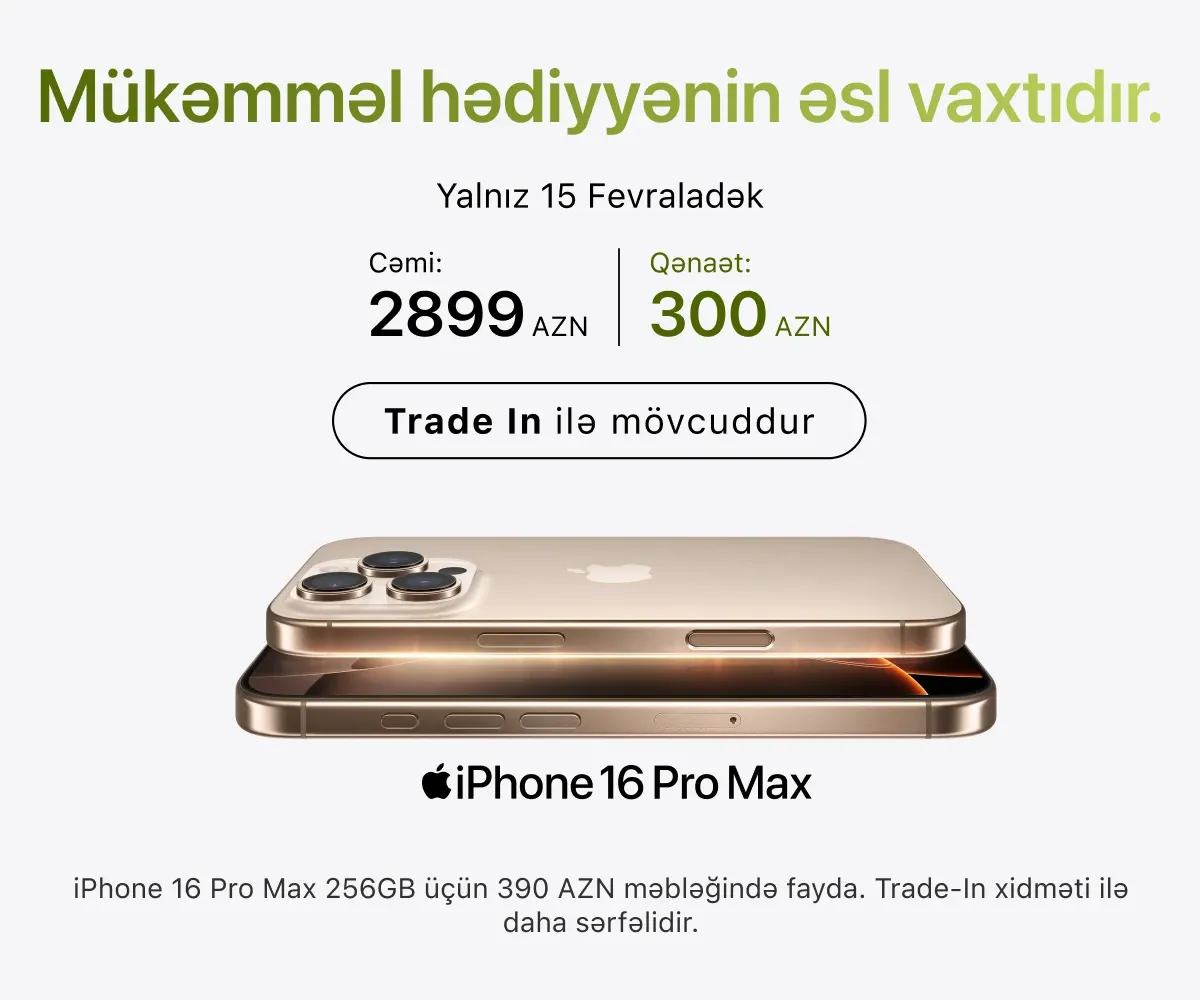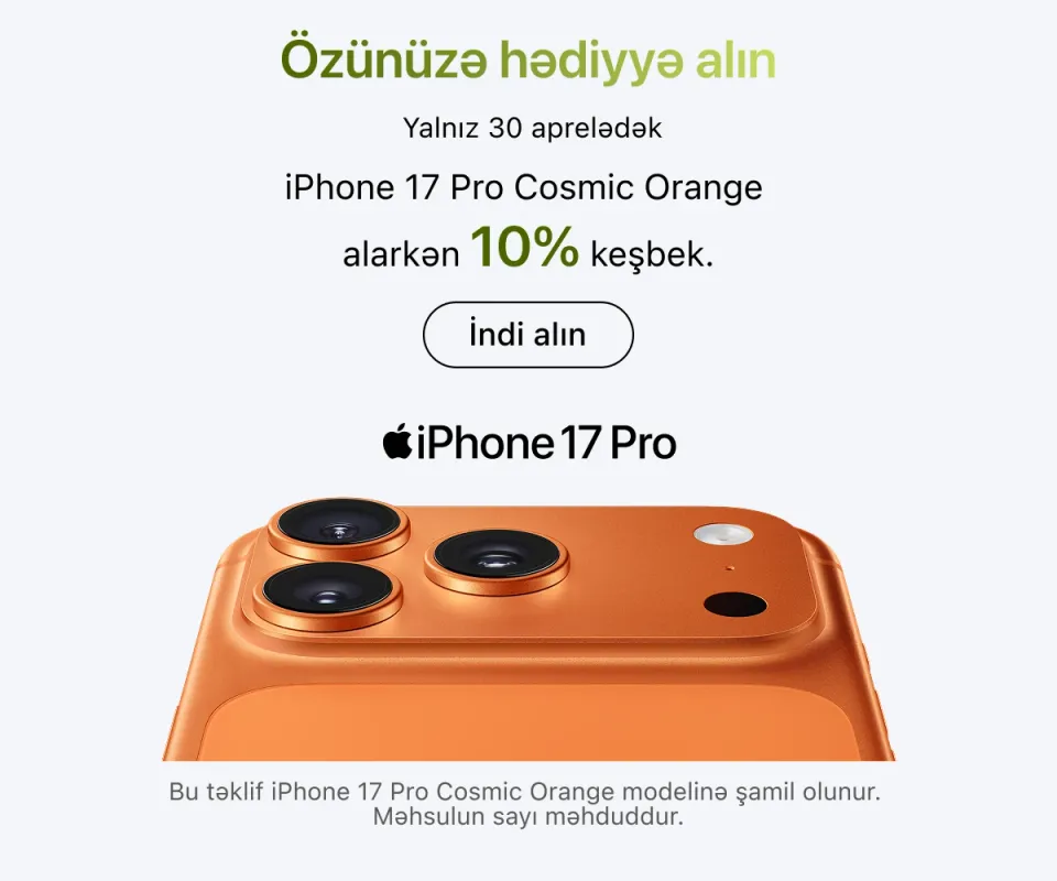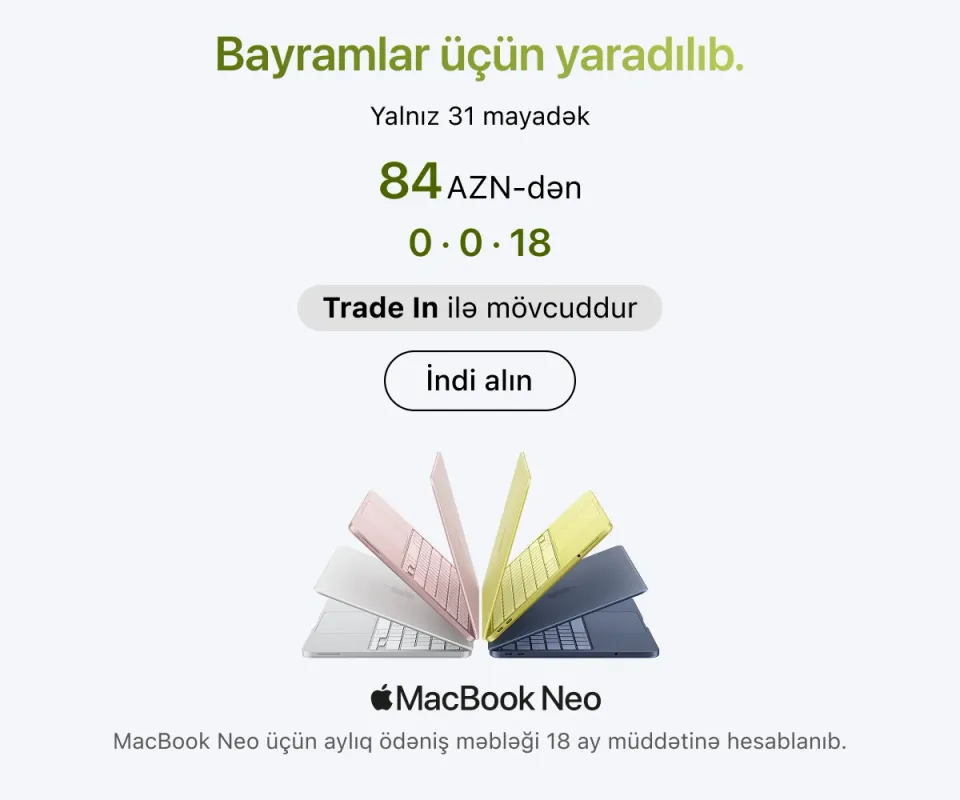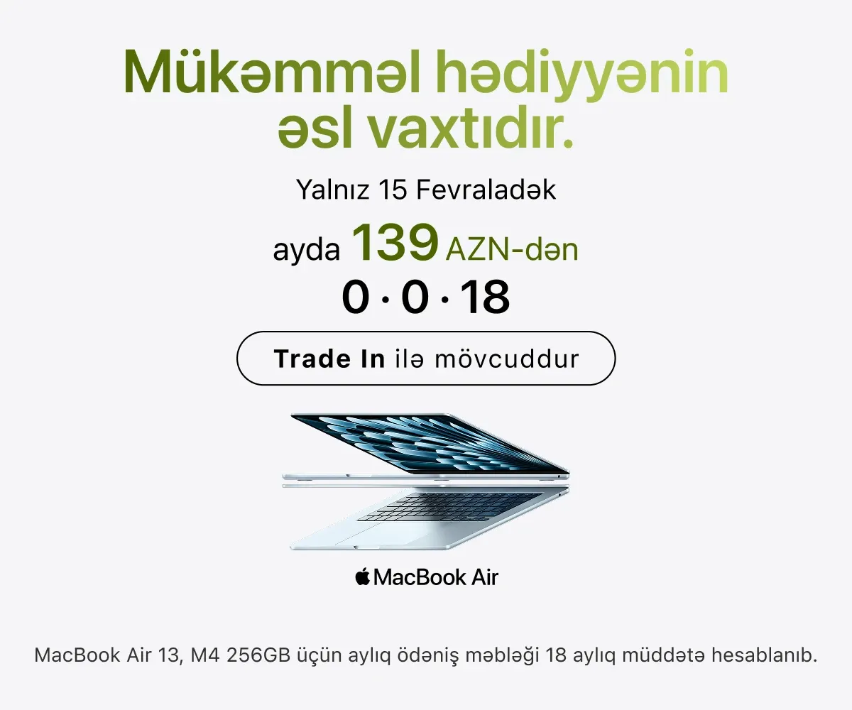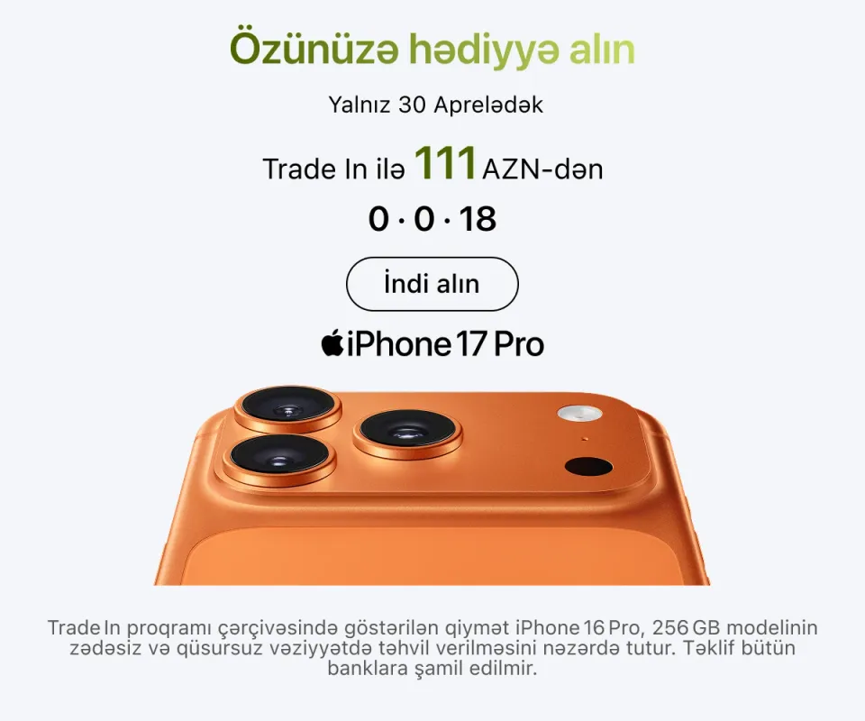 Ən son model iPhone-lar – həm baza versiyaları, həm də Pro variantları daim mövcuddur. İş, təhsil və yaradıcılıq üçün iPad və MacBook modellərini, stasionar istifadə üçün isə iMac, Mac Studio və Studio Display ekranını seçə bilərsiniz.