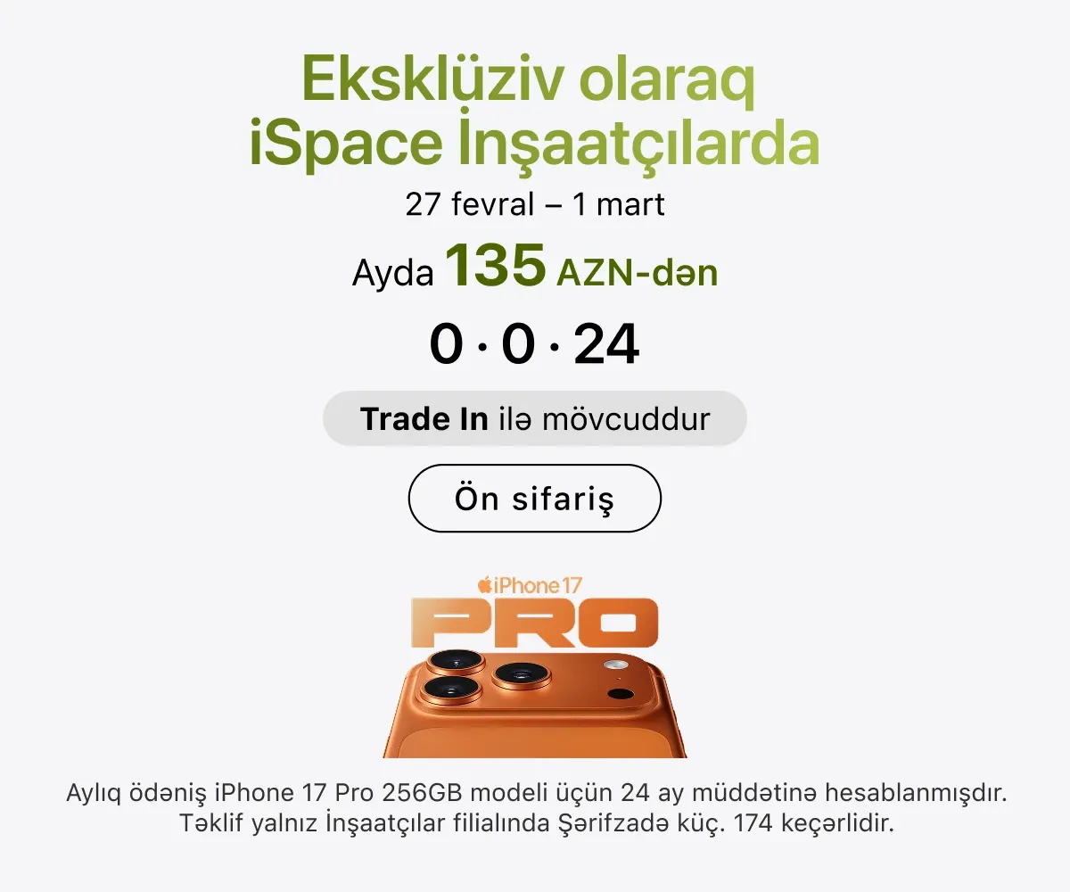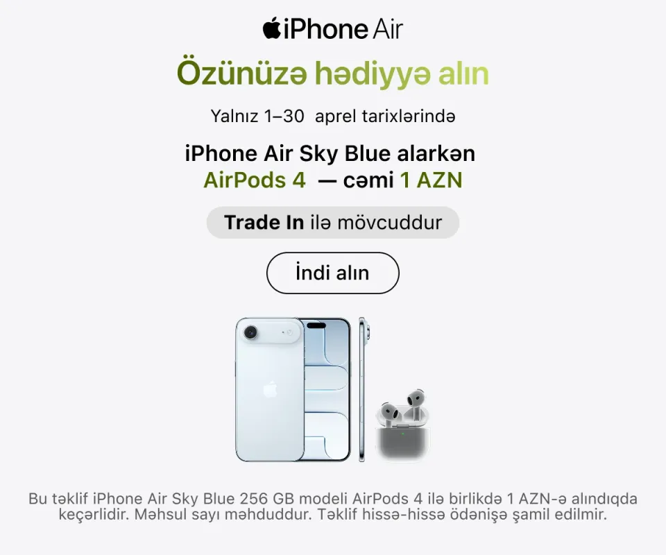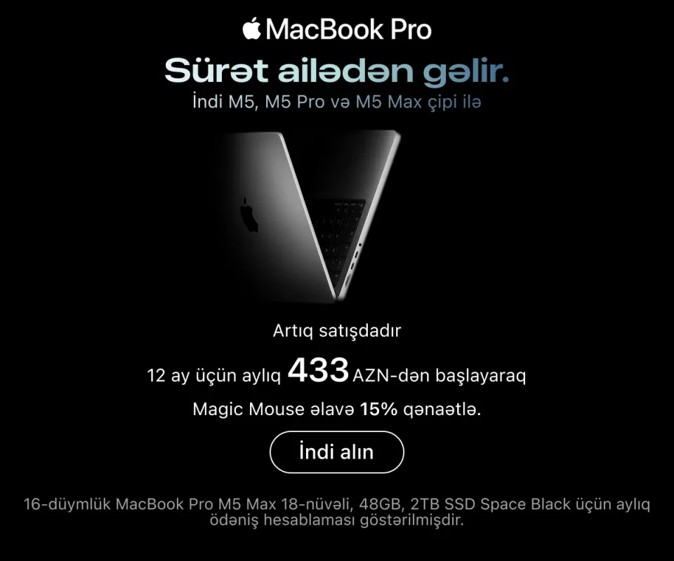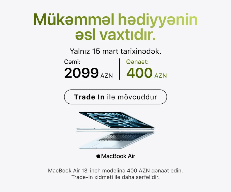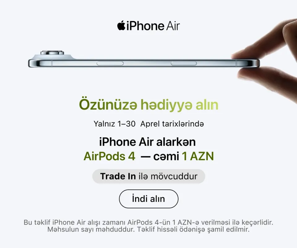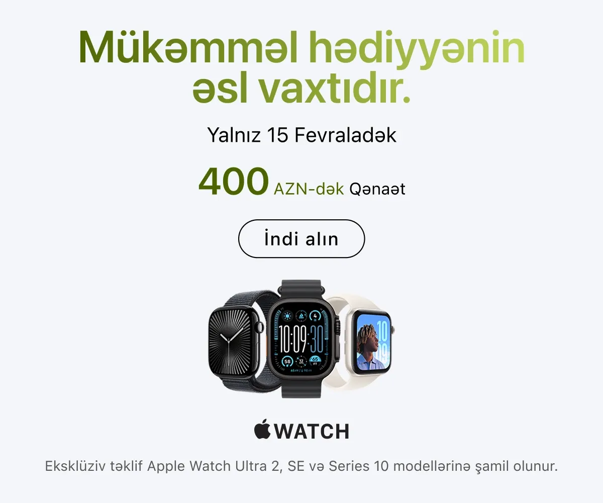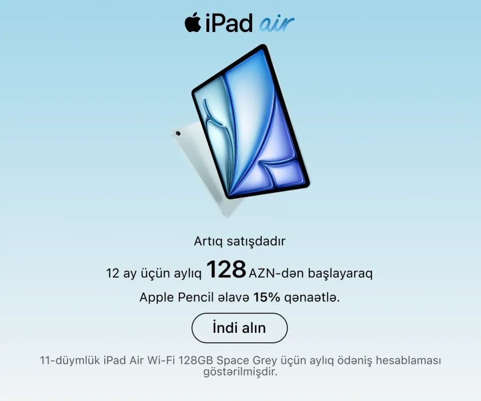 Ən son model iPhone-lar – həm baza versiyaları, həm də Pro variantları daim mövcuddur. İş, təhsil və yaradıcılıq üçün iPad və MacBook modellərini, stasionar istifadə üçün isə iMac, Mac Studio və Studio Display ekranını seçə bilərsiniz.