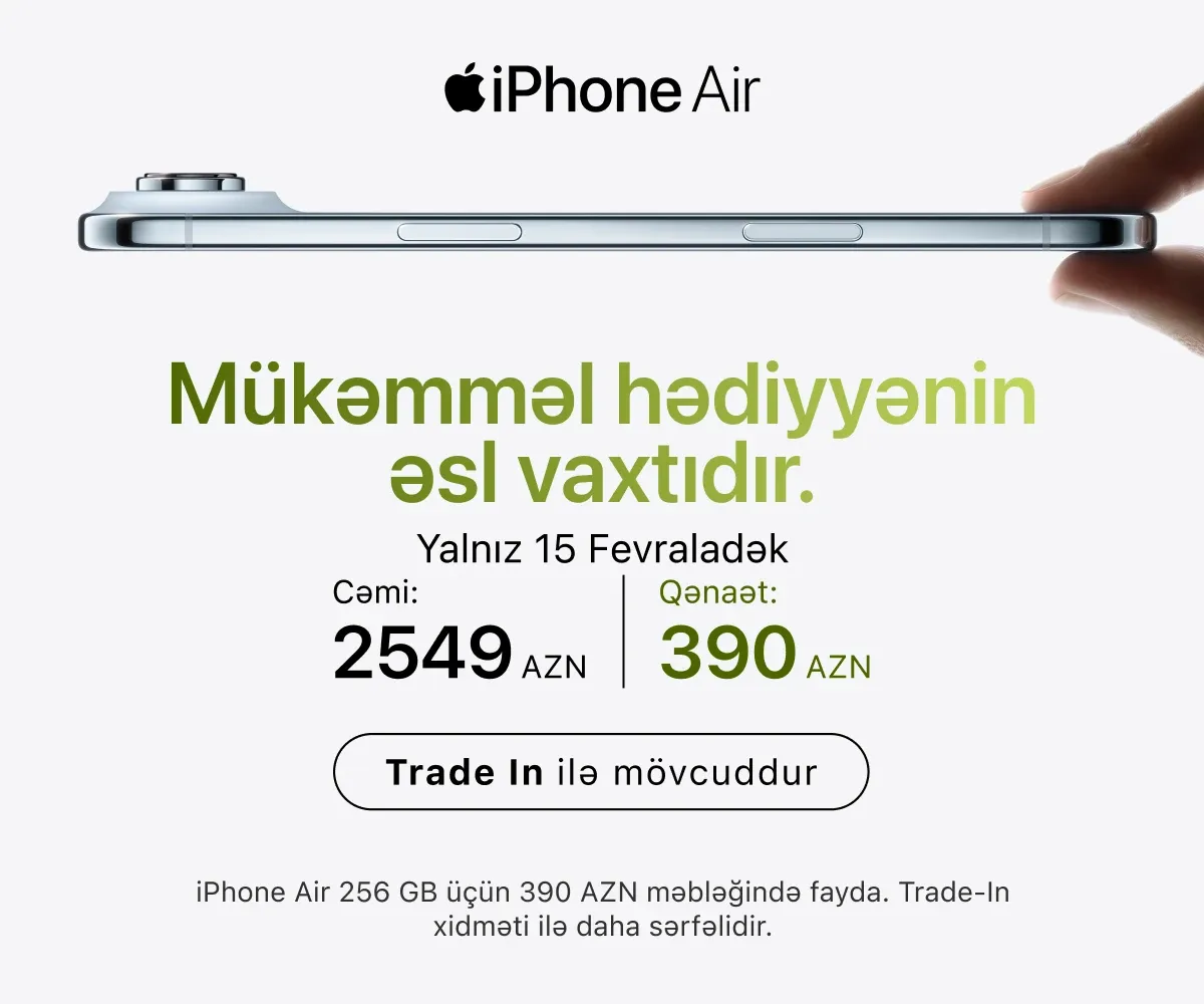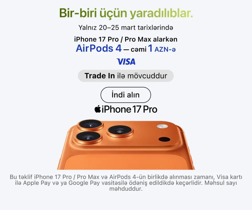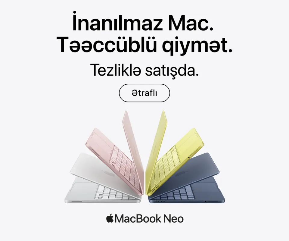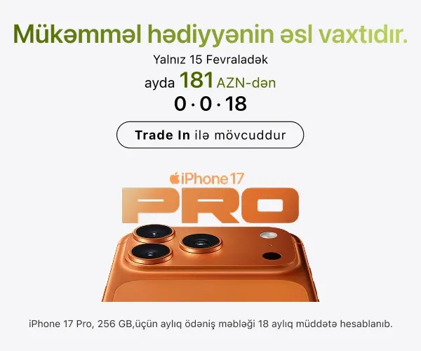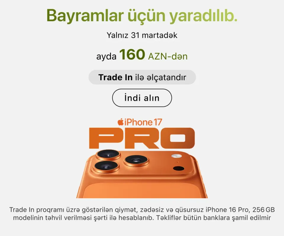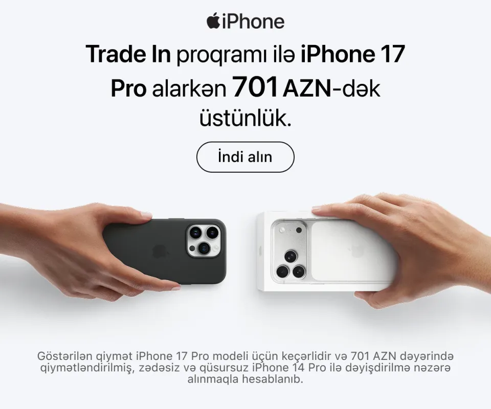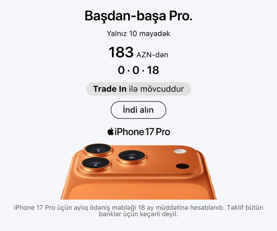 Ən son model iPhone-lar – həm baza versiyaları, həm də Pro variantları daim mövcuddur. İş, təhsil və yaradıcılıq üçün iPad və MacBook modellərini, stasionar istifadə üçün isə iMac, Mac Studio və Studio Display ekranını seçə bilərsiniz.