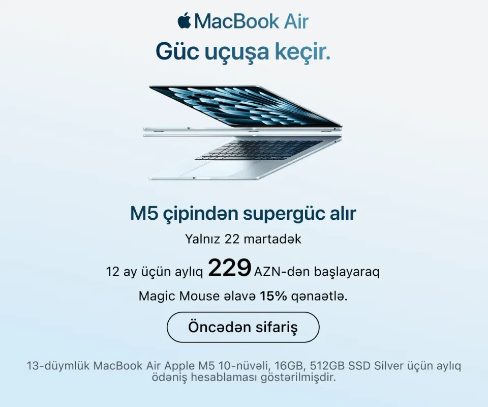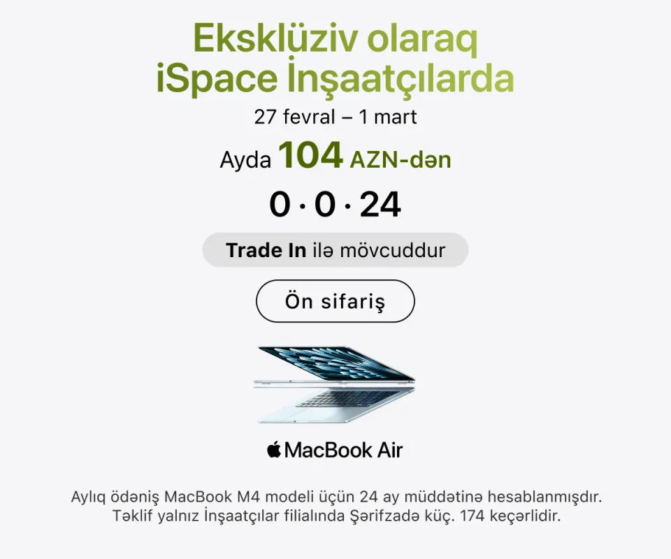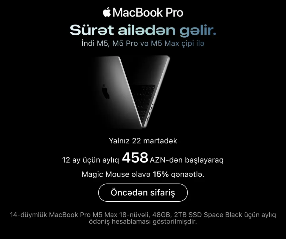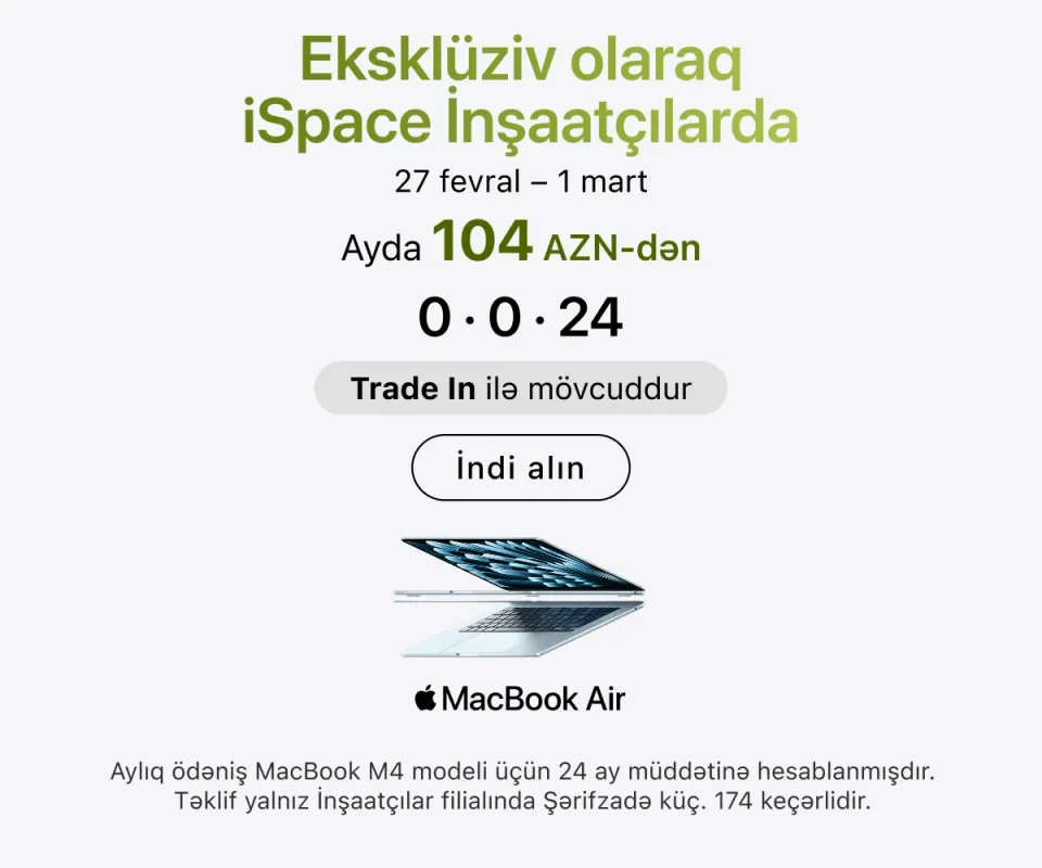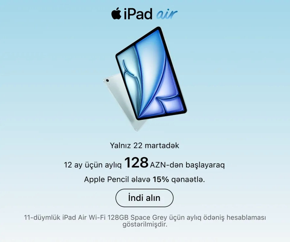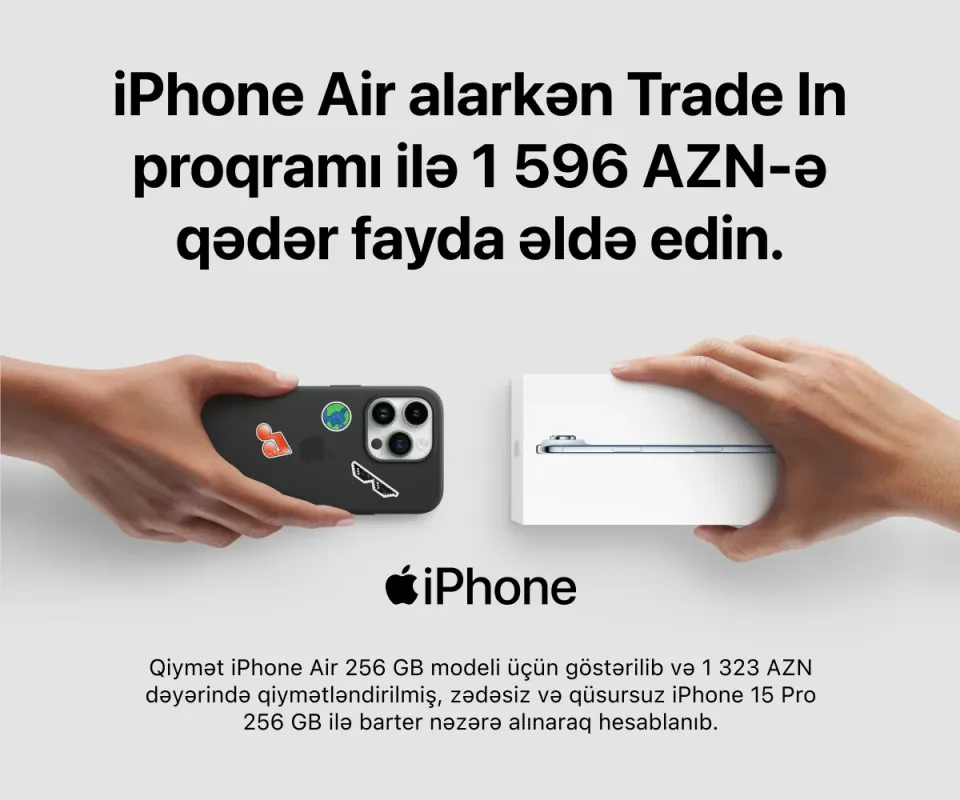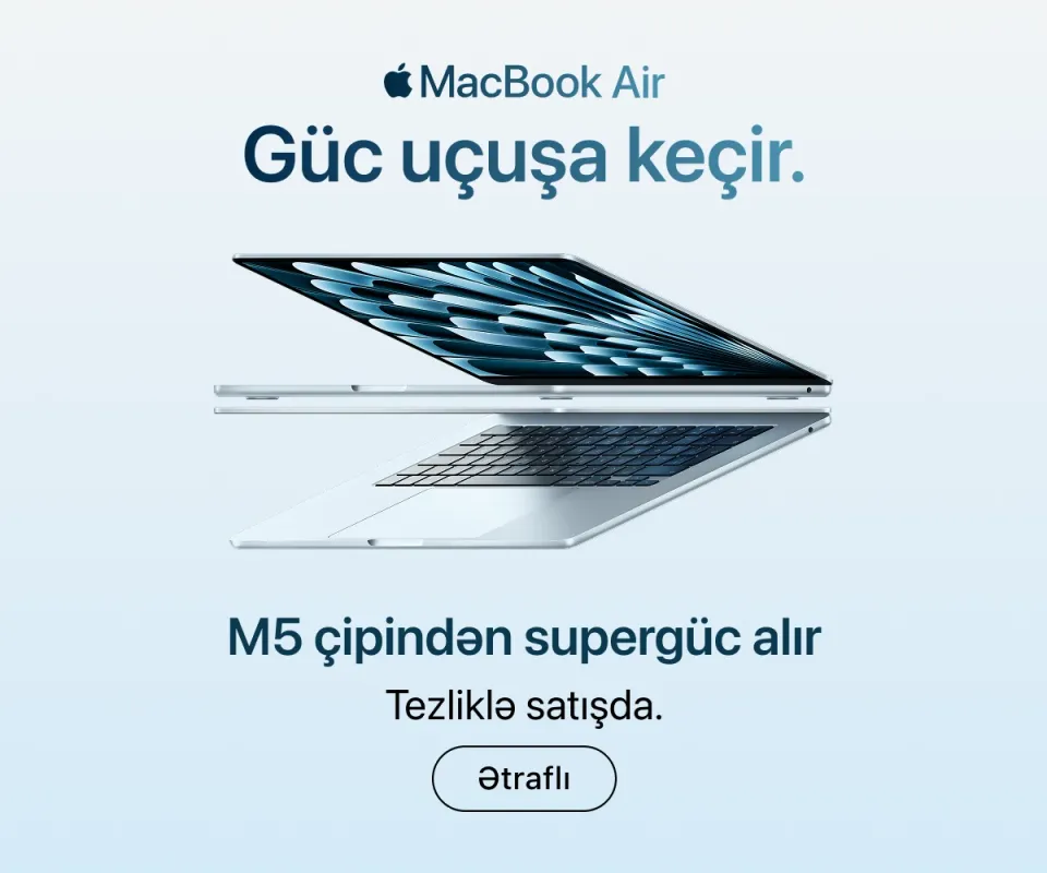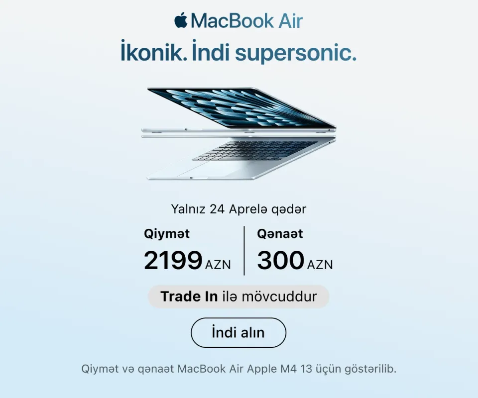 Ən son model iPhone-lar – həm baza versiyaları, həm də Pro variantları daim mövcuddur. İş, təhsil və yaradıcılıq üçün iPad və MacBook modellərini, stasionar istifadə üçün isə iMac, Mac Studio və Studio Display ekranını seçə bilərsiniz.