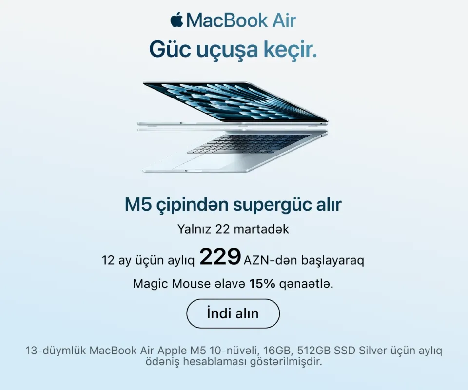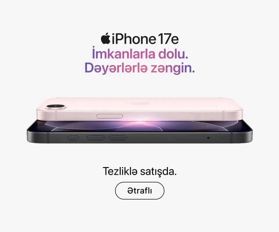 Apple mağazamıza baş çəkərək brendin bütün aktual məhsullarına çıxış əldə edirsiniz – iPhone-dan tutmuş Mac Studio-ya qədər. Burada istədiyiniz smartfon modelini seçə, iş üçün uyğun konfiqurasiyanı qura və ya cihazınızı daha müasir versiya ilə əvəz edə bilərsiniz.