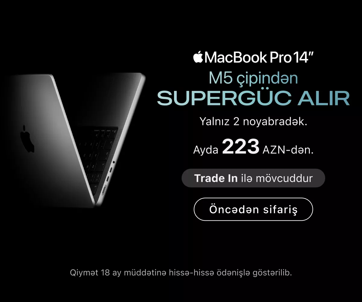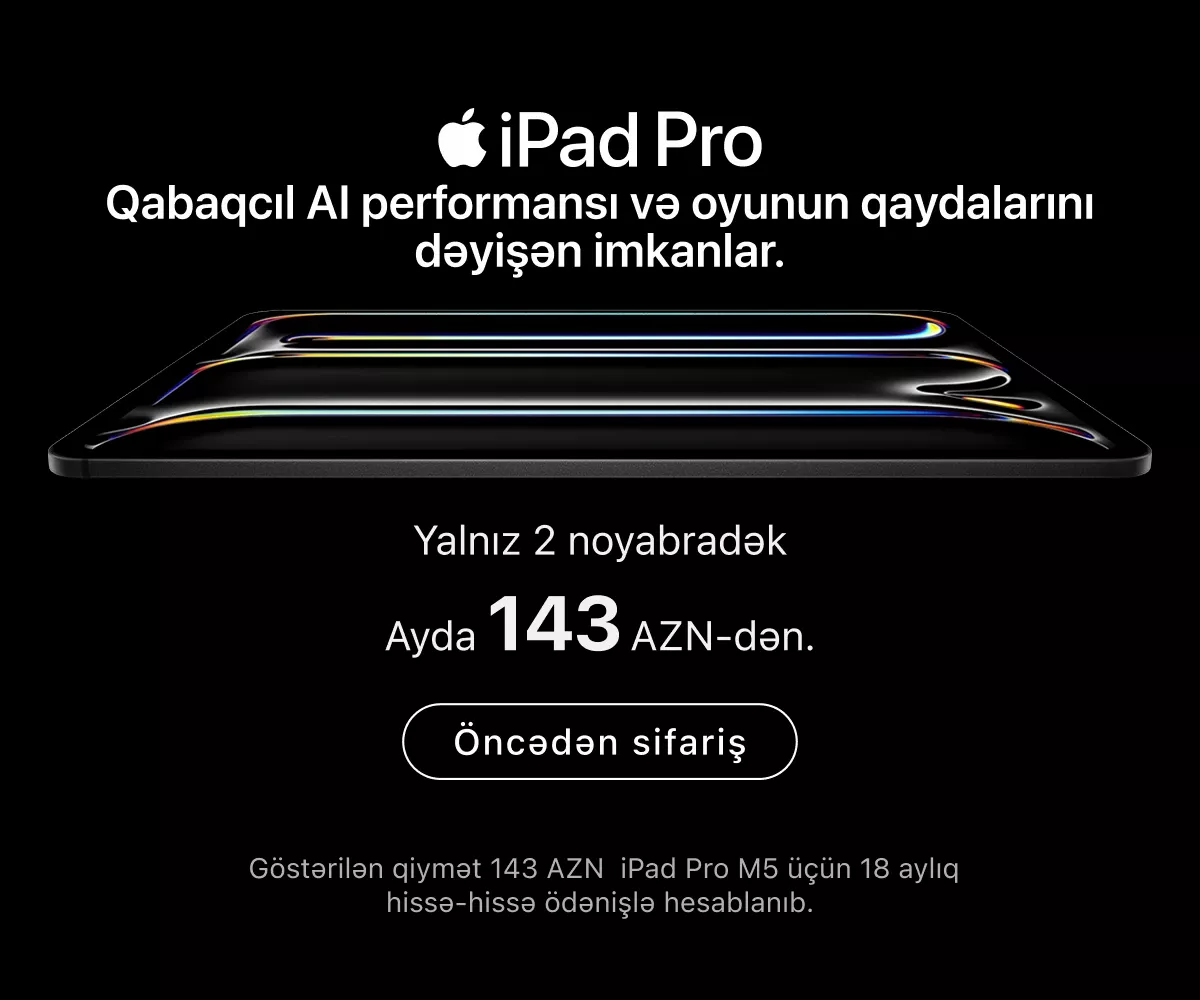 Ən son model iPhone-lar – həm baza versiyaları, həm də Pro variantları daim mövcuddur. İş, təhsil və yaradıcılıq üçün iPad və MacBook modellərini, stasionar istifadə üçün isə iMac, Mac Studio və Studio Display ekranını seçə bilərsiniz.
