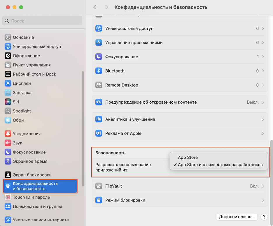 - in the Security section, allow the option “App Store and Identified Developers.”