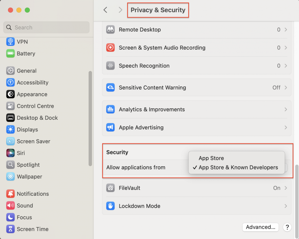 - in the Security section, allow the option “App Store and Identified Developers.”