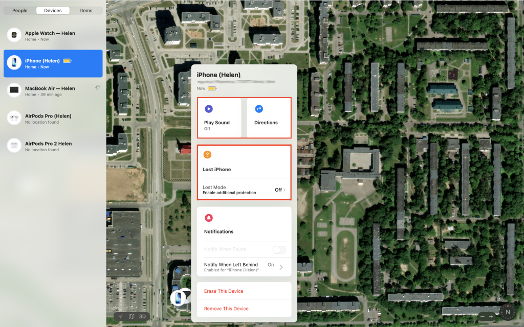 Here, you can also enable the lost mode (“Lost Mode”) and send a message with your contacts to the device. This way, the person who finds the device can contact you. And if the device was turned off, the system will show where it was last located and how much time has passed since it was turned off. If you are certain of theft, there’s an option to erase all data from the device through “Erase This Device.”