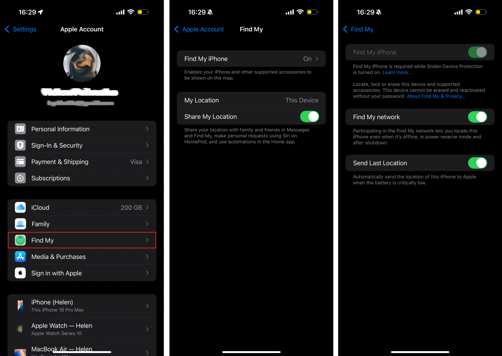 To enable the function and understand how to set up “Find My” on iPhone, grab your device right now. Go to “Settings”. Tap on your name (Apple ID), then select “Find My”. Activate the necessary options: