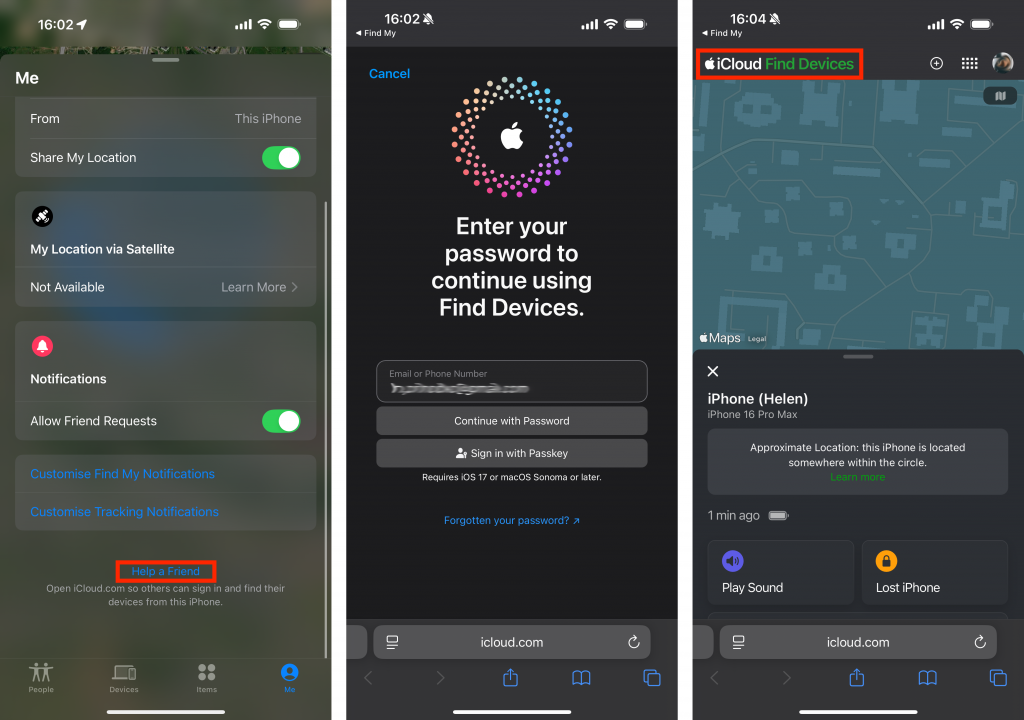 In this case, go to settings, launch the “Find My” app, and at the bottom of the “Me” tab, look for the “Help a Friend” (or “Help Friends” on Mac) label. Choose “Use Another Apple ID,” enter the login and password for the lost device’s Apple ID. Then choose one of the search options we’ve described above.