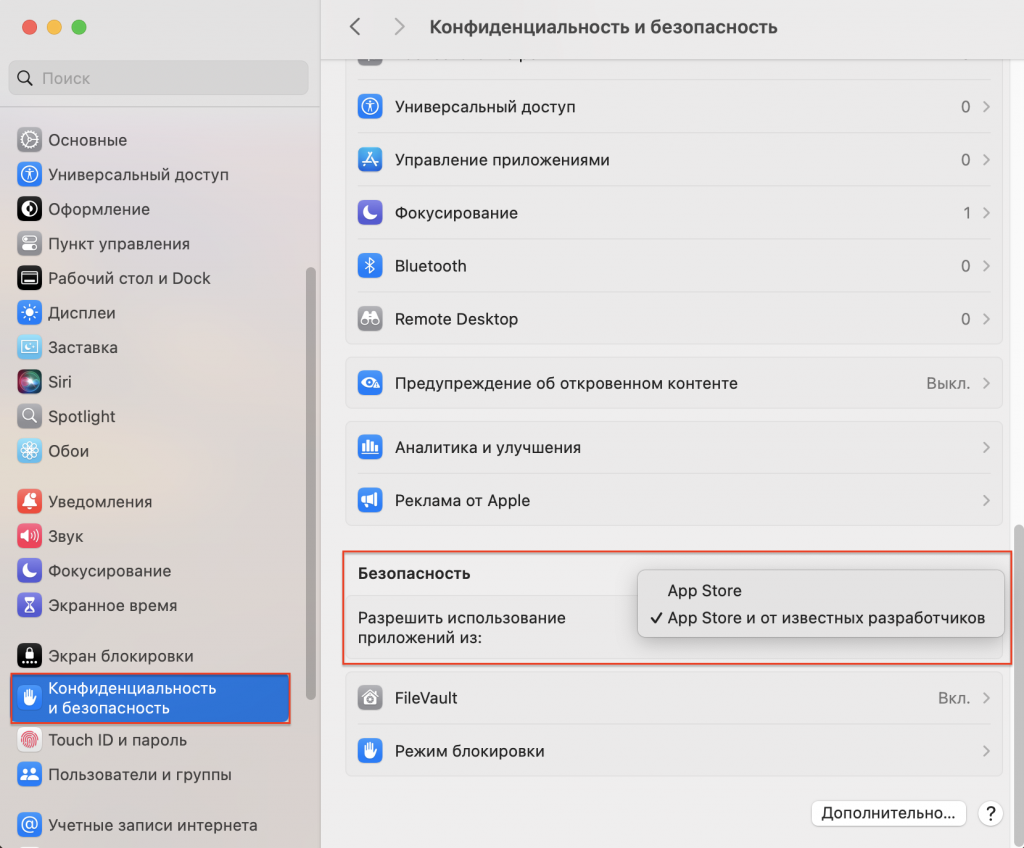 - в разделе «Безопасность» разрешите опцию «App Store и от известных разработчиков».