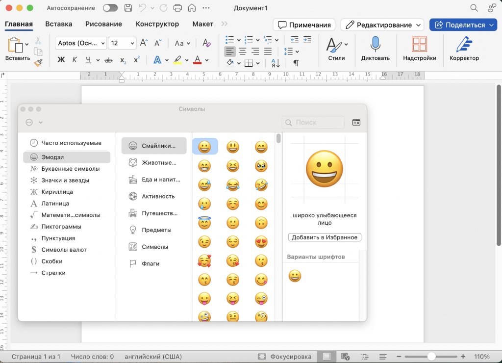 Одновременно зажмите на клавиатуре Control + Command + Пробел, после чего на дисплее появится панель со смайлами. Если вы пользуетесь пакетом Office от Microsoft, в меню «Правка» зайдите во вкладку «Эмодзи и символы» и выберите подходящий смайл. Во встроенных программах Apple (например, Pages) такое же меню доступно в пункте «Редактирование».