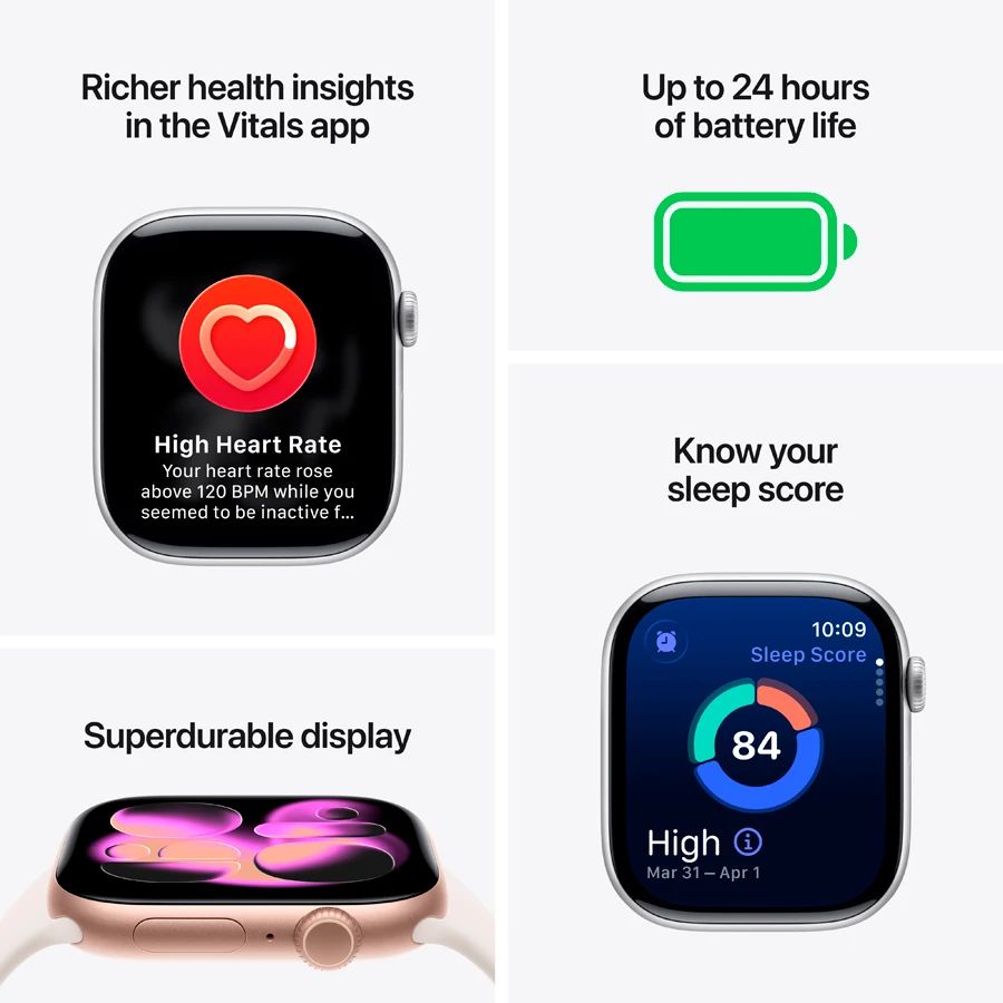 Apple Watch Series 11 brings you invaluable health insights including hypertension notifications and sleep score. Boost your fitness with advanced metrics. Get up to 24 hours of battery life.