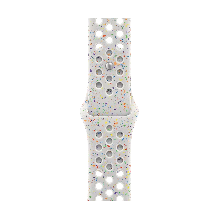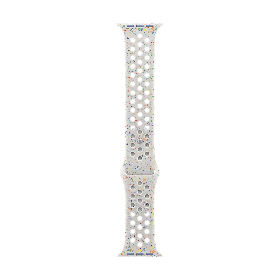 The Nike Sport Band is characterized by enhanced durability, reliability, and surprising softness, while the compression-molded perforations allow air to reach the skin. Bright color speckles create a random pattern, making each band unique. The band, made from dense smooth material, elegantly wraps around the wrist and provides a comfortable fit. A new matte-finish aluminum pin-and-tuck closure.