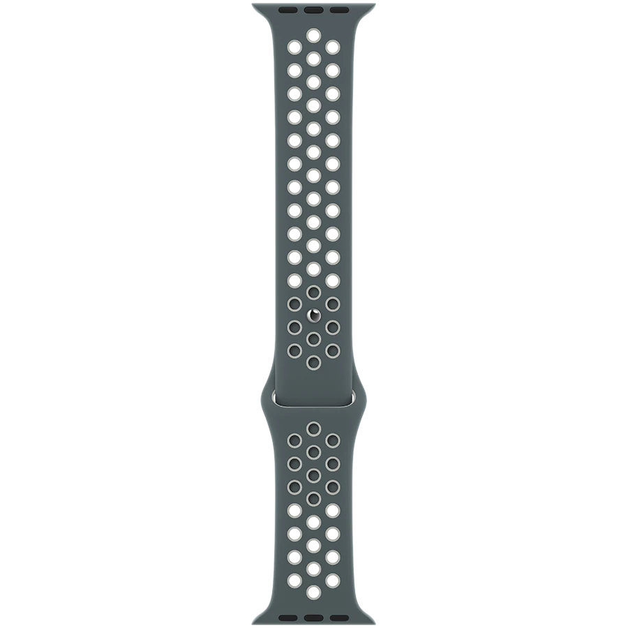 The Nike Sport Band is characterized by enhanced durability, reliability, and surprising softness, while the compression-molded perforations allow air to reach the skin. Bright color speckles create a random pattern, making each band unique. The band, made from dense smooth material, elegantly wraps around the wrist and provides a comfortable fit. A new matte-finish aluminum pin-and-tuck closure.
