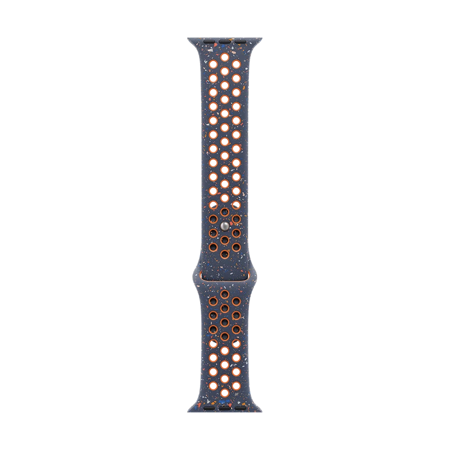 The Nike Sport Band is characterized by enhanced durability, reliability, and surprising softness, while the compression-molded perforations allow air to reach the skin. Bright color speckles create a random pattern, making each band unique. The band, made from dense smooth material, elegantly wraps around the wrist and provides a comfortable fit. A new matte-finish aluminum pin-and-tuck closure.