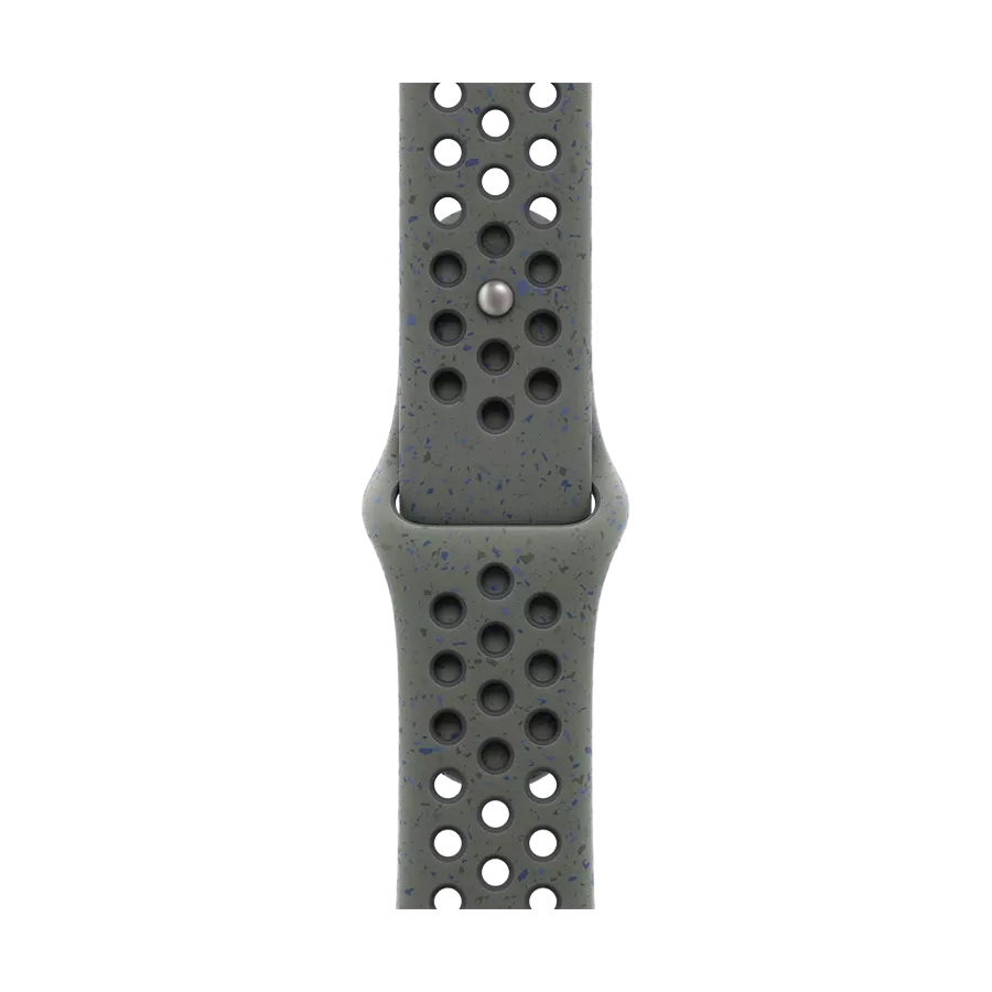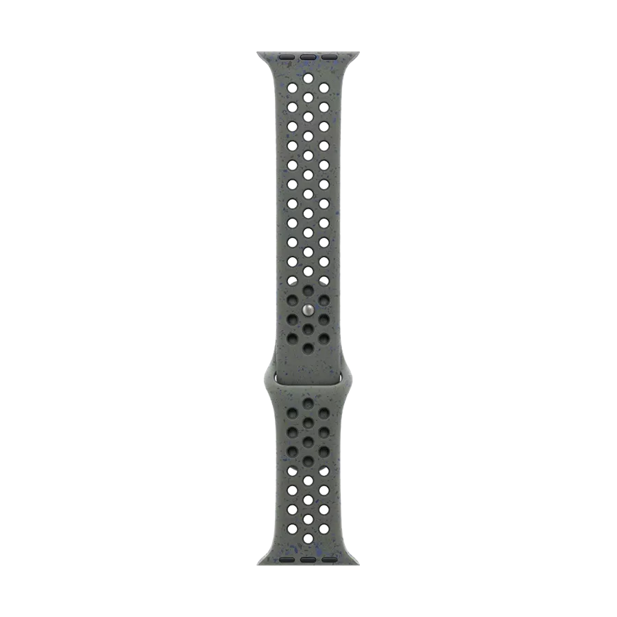 The Nike Sport Band is characterized by enhanced durability, reliability, and surprising softness, while the compression-molded perforations allow air to reach the skin. Bright color speckles create a random pattern, making each band unique. The band, made from dense smooth material, elegantly wraps around the wrist and provides a comfortable fit. A new matte-finish aluminum pin-and-tuck closure.
