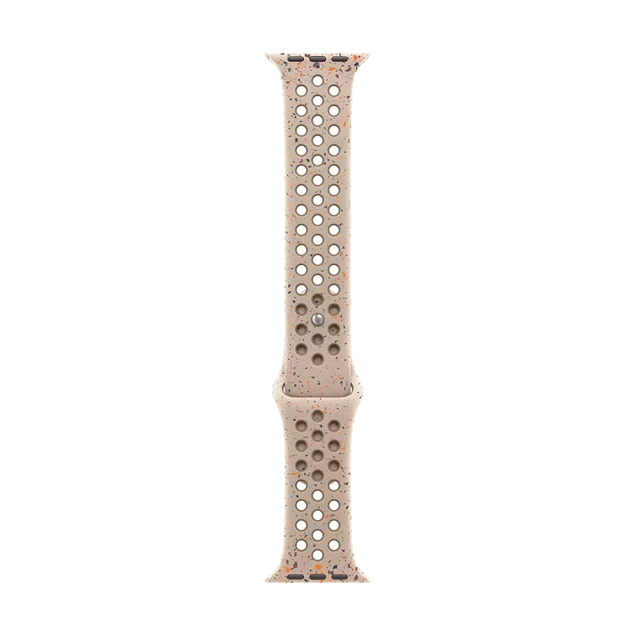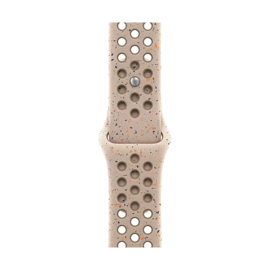 The Nike Sport Band is characterized by enhanced durability, reliability, and surprising softness, while the compression-molded perforations allow air to reach the skin. Bright color speckles create a random pattern, making each band unique. The band, made from dense smooth material, elegantly wraps around the wrist and provides a comfortable fit. A new matte-finish aluminum pin-and-tuck closure.