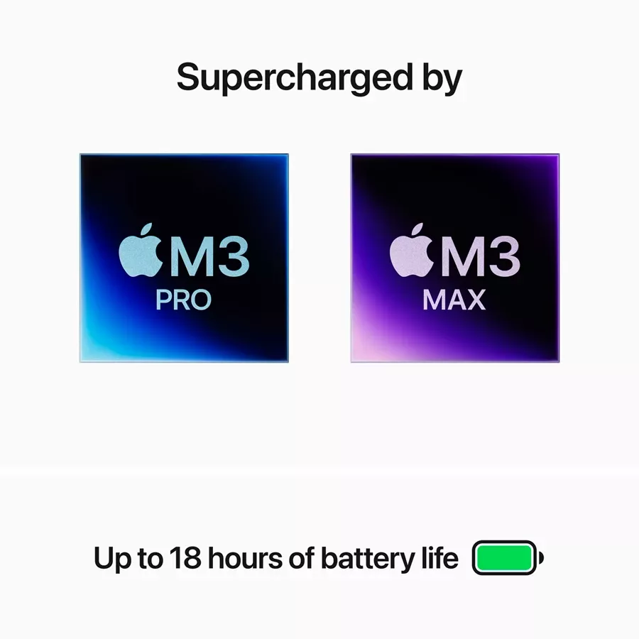 - SUPERCHARGED BY M3 PRO OR M3 MAX—The Apple M3 Pro chip, with an up to 12-core CPU and up to 18-core GPU using hardware-accelerated ray tracing, delivers extraordinary performance for demanding workflows like manipulating gigapixel panoramas or compiling millions of lines of code. M3 Max, with an up to 16-core CPU and up to 40-core GPU, drives extreme performance for the most advanced workflows like rendering intricate 3D content or developing transformer models with billions of parameters.
