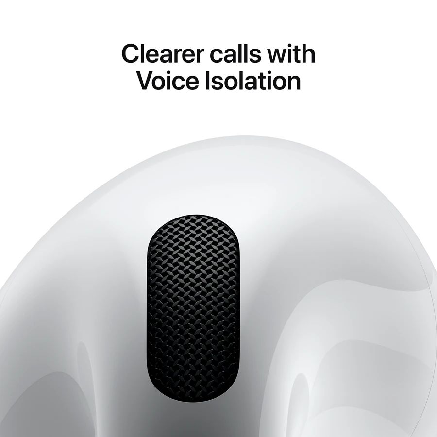 - IMPROVED SOUND AND CALL QUALITY—AirPods 4 feature the Apple-designed H2 chip. Voice Isolation improves the quality of phone calls in loud conditions. Using advanced computational audio, it reduces background noise while isolating and clarifying the sound of your voice for whoever you’re speaking to.