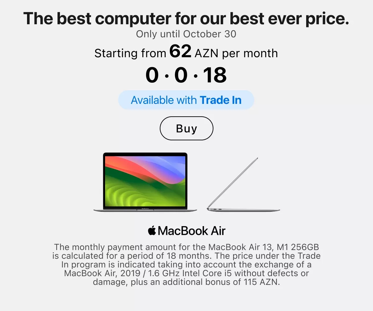 You can place an order online with delivery across Azerbaijan or in any retail store — in all cases, original Apple equipment is presented everywhere. Current locations of stores and service centers are listed on the website. Buy gadgets of a trusted brand and use them for your joy.