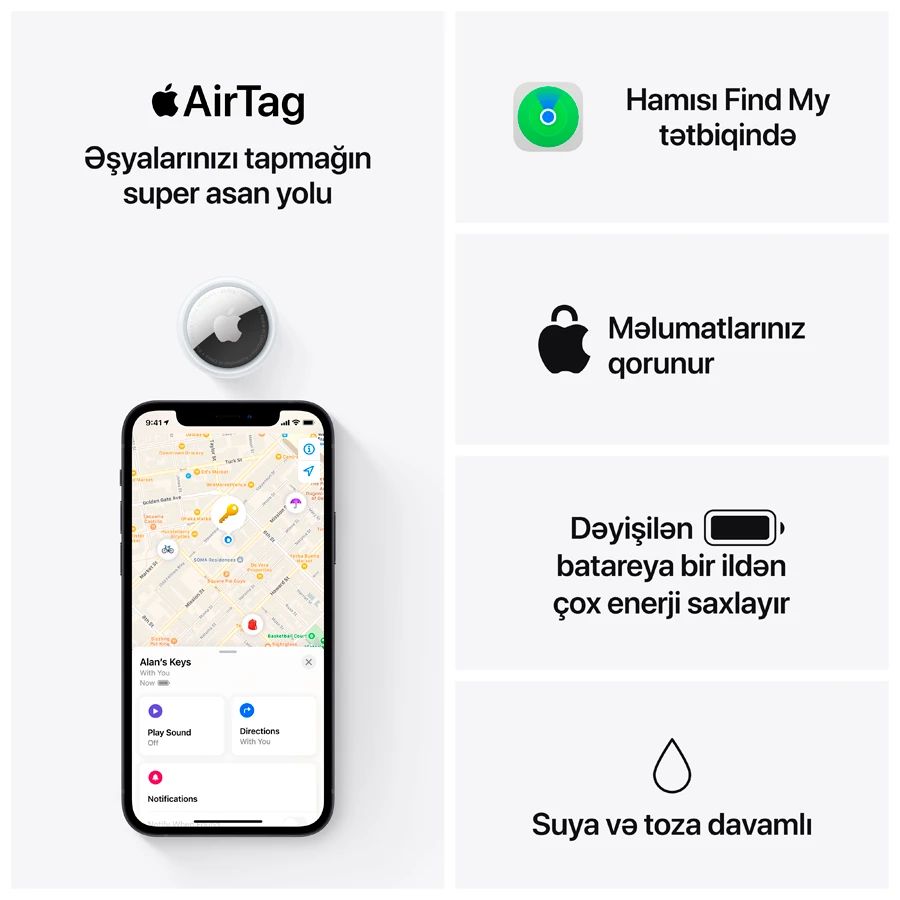 AirTag trekerləri sizə Find My tətbiqi ilə açarlarınızın, pulqabınızın, çantanızın və digər əşyalarınızın yerini öyrənməkdə yardımçı olur. Hətta itirdiklərinizi səs ilə tapmaq üçün AirTag-in daxili dinamikinə siqnal göndərə bilərsiniz. Yox, əgər AirTag-iniz uzaqdadırsa, onu Find My şəbəkəsindəki yüz milyonlarla Apple cihazının köməyilə izləyin. Bu zaman məlumatlar anonim şəkildə ötürülür və məxfiliyin qorunması üçün şifrələnir.