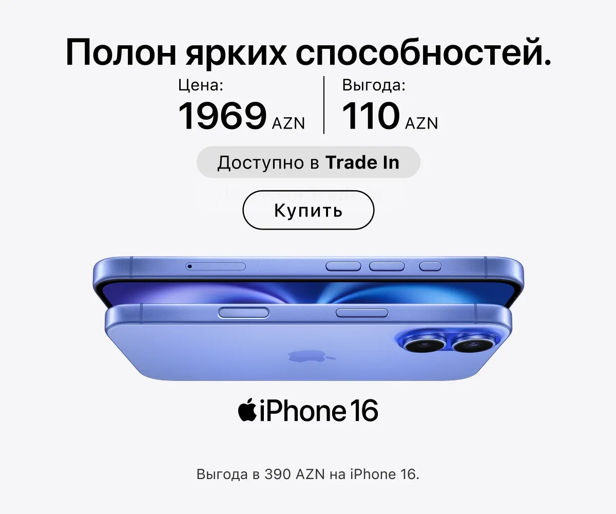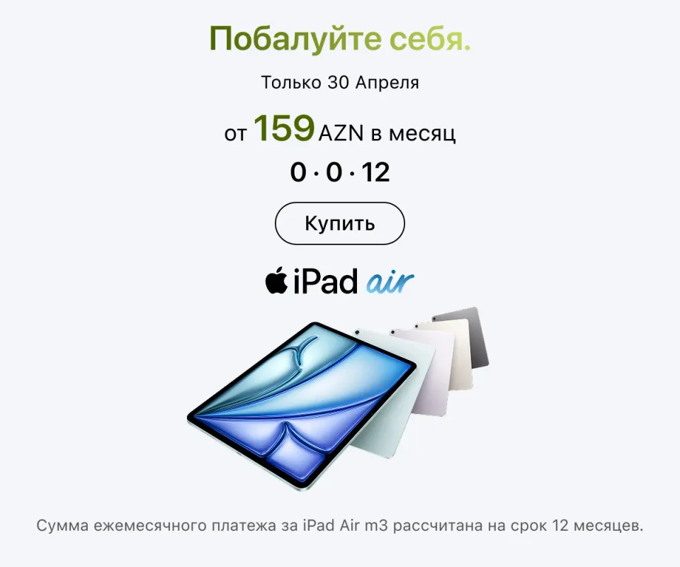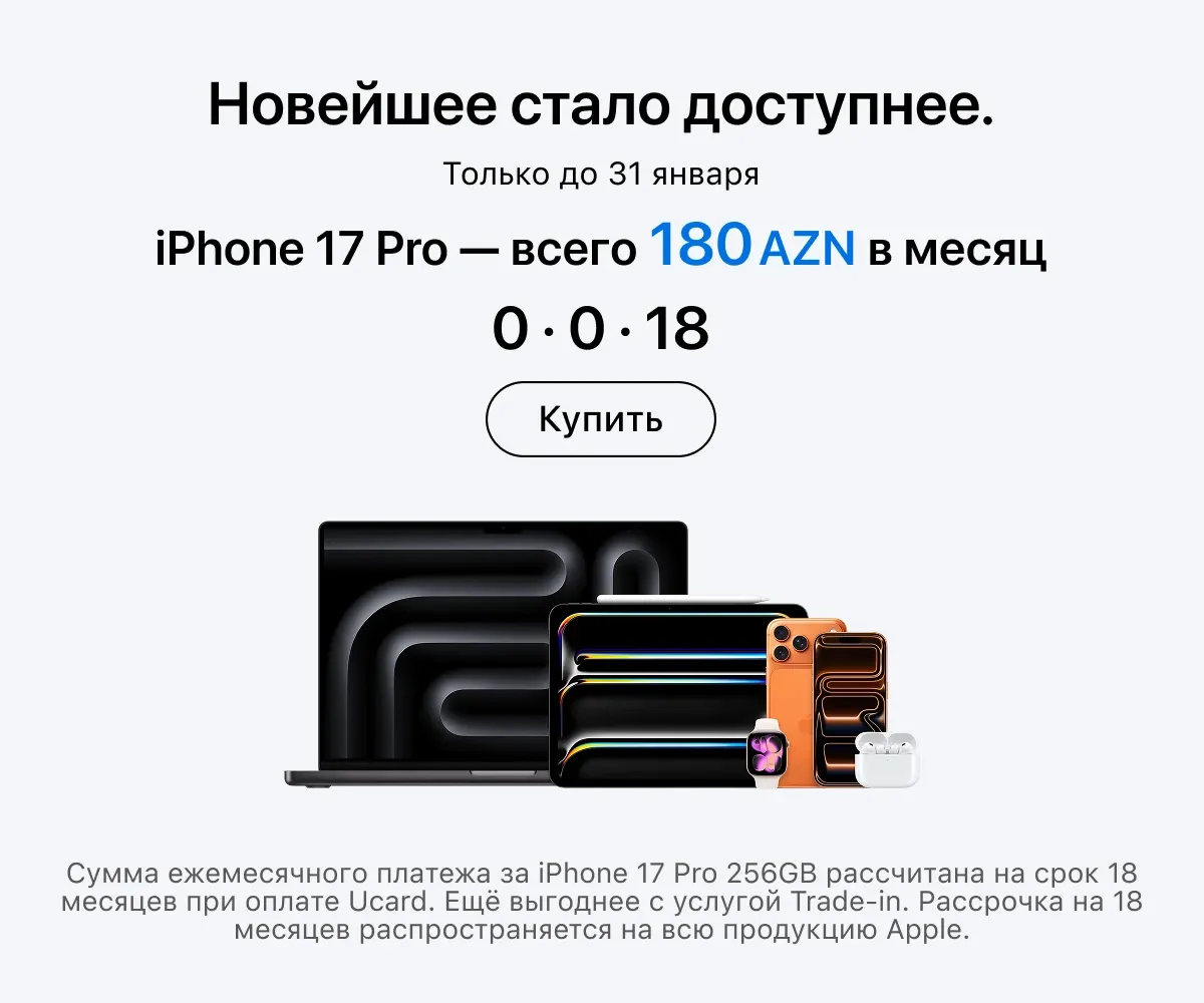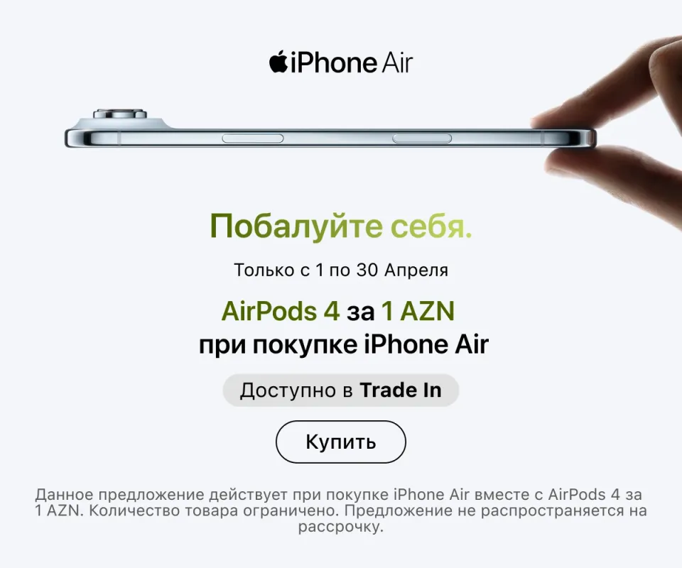 Оформить заказ можно онлайн с доставкой по всему Азербайджану или в любом розничном магазине — в любом случае всюду представлена оригинальная техника Apple. Актуальные адреса магазинов и сервисных центров указаны на сайте. Покупайте гаджеты проверенного бренда и пользуйтесь ею в свое удовольствие.