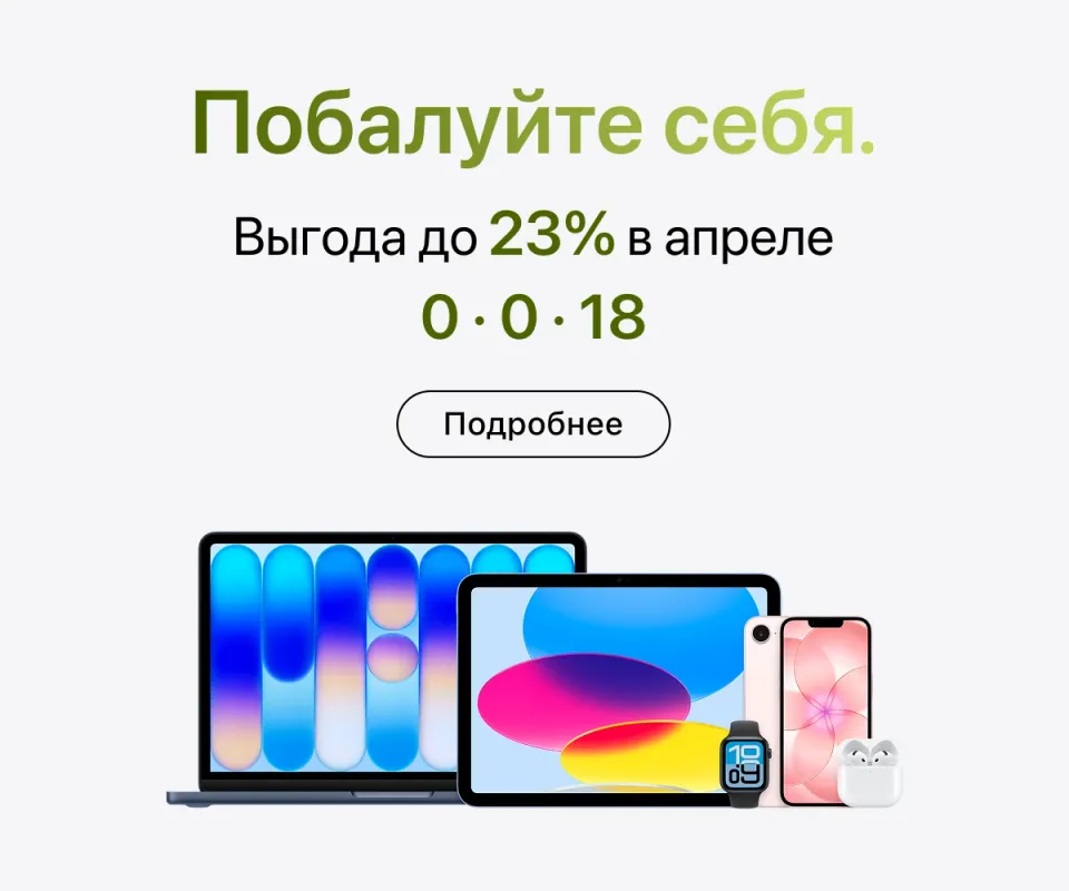 В наличии все последние модели iPhone — от базовых до Pro-версий. Для работы, учебы и творчества можно подобрать iPad и MacBook, а для стационарной работы — iMac или Mac Studio и дисплей Studio Display.